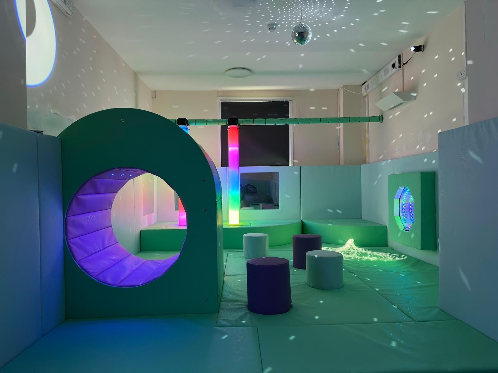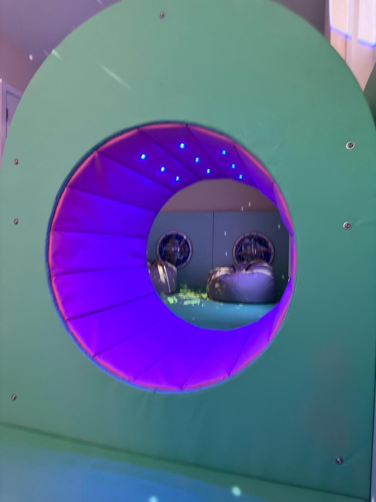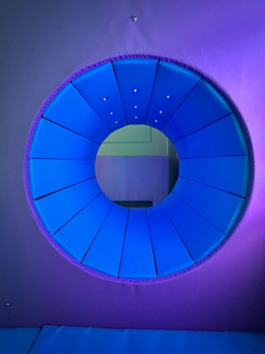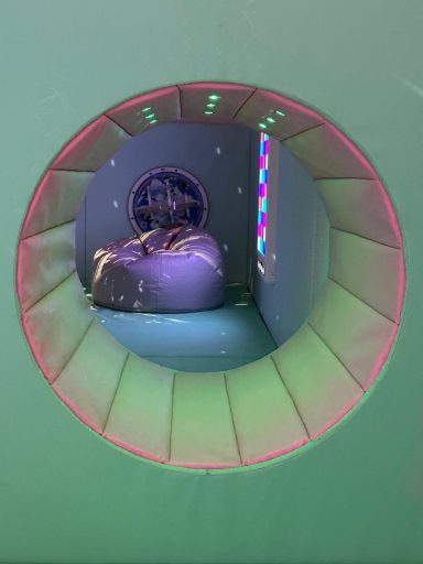 Encased in a soft, padded cocoon-style structure with rounded edges and wipe clean vinyl, the pod creates an immediate sense of security and containment. Its interior is equipped with multi-sensory features that can be independently controlled by the user through large, intuitive, picture-based or touch-sensitive buttons, promoting autonomy and reducing reliance on caregivers during distress.